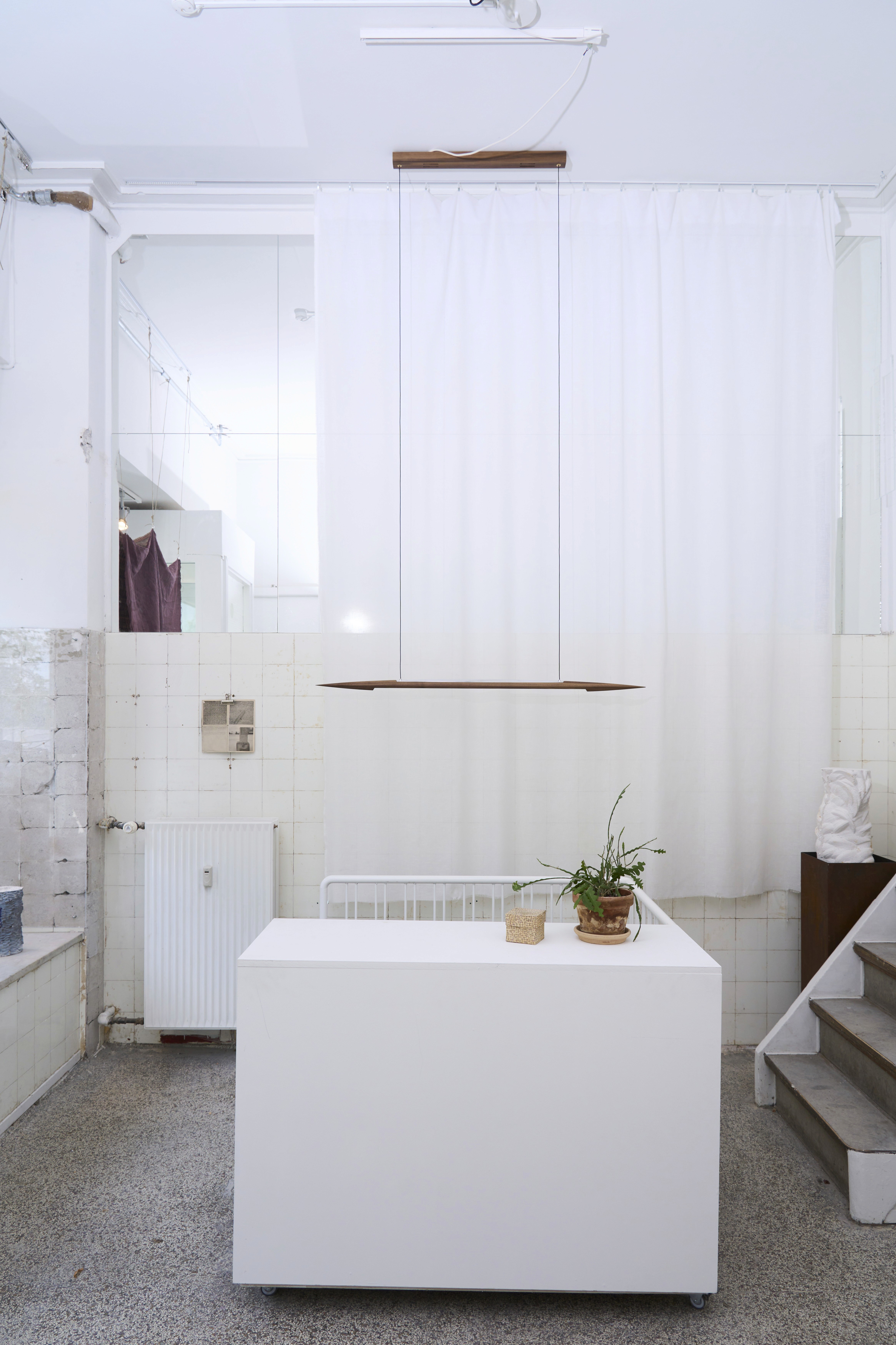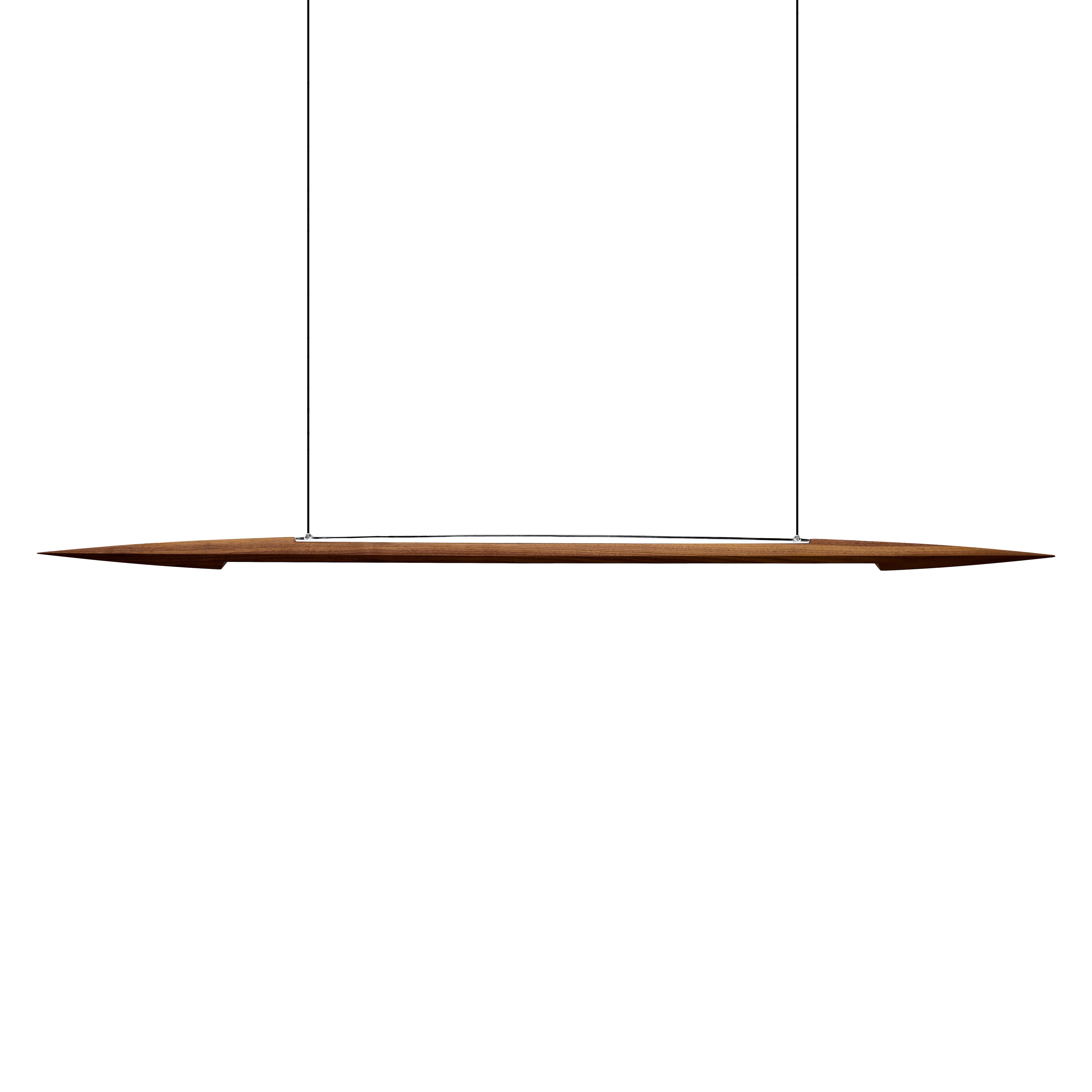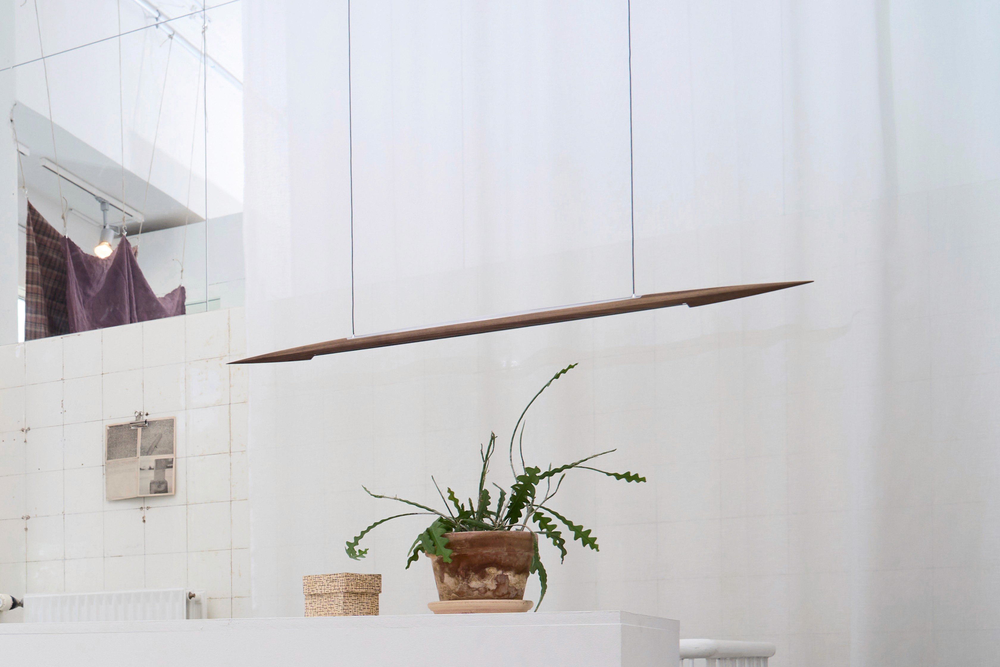 Dimmable pendant with atmospheric to functional light. Suspended by two, thin textile cords, the shade is connected to it’s ceiling canopy that covers the power supply.
