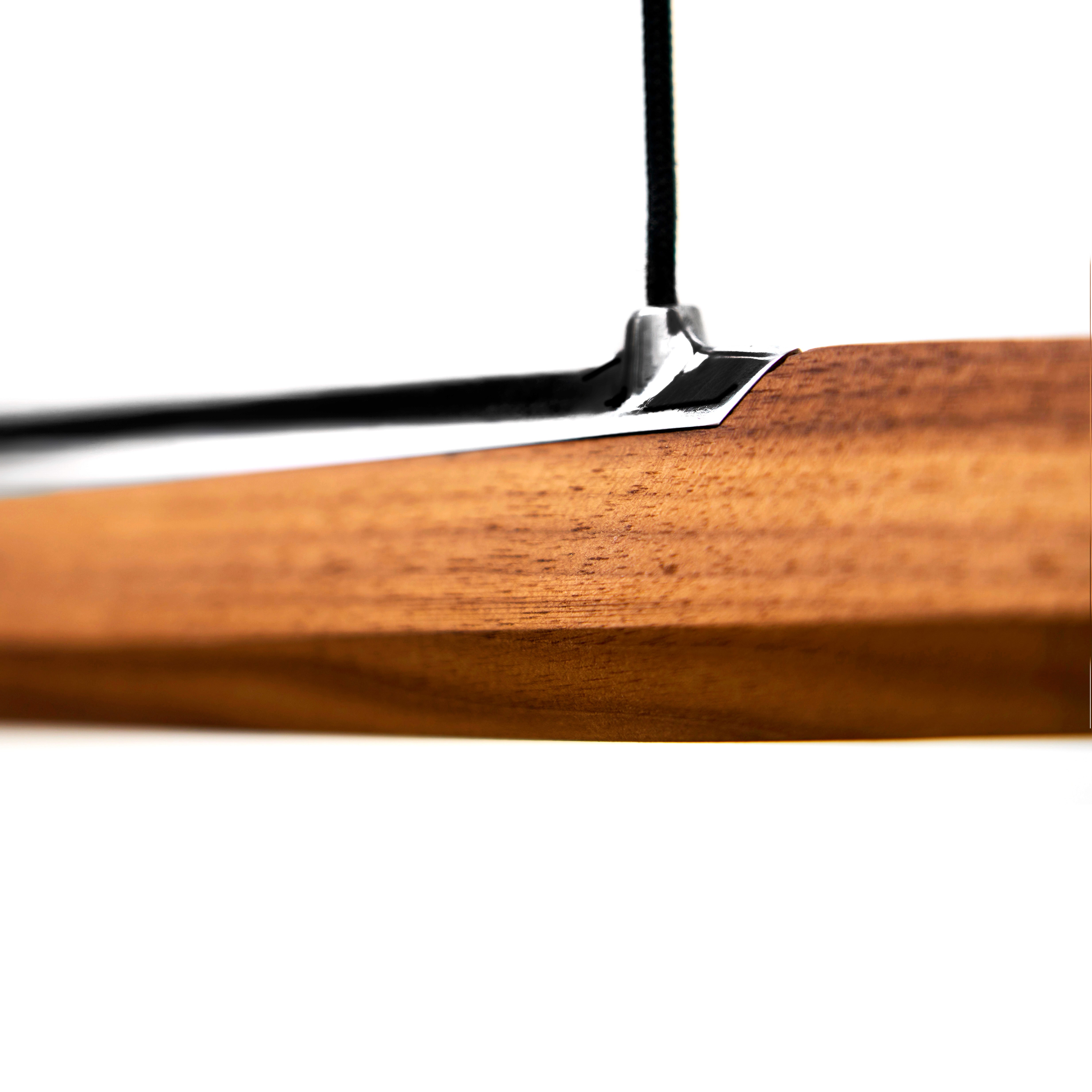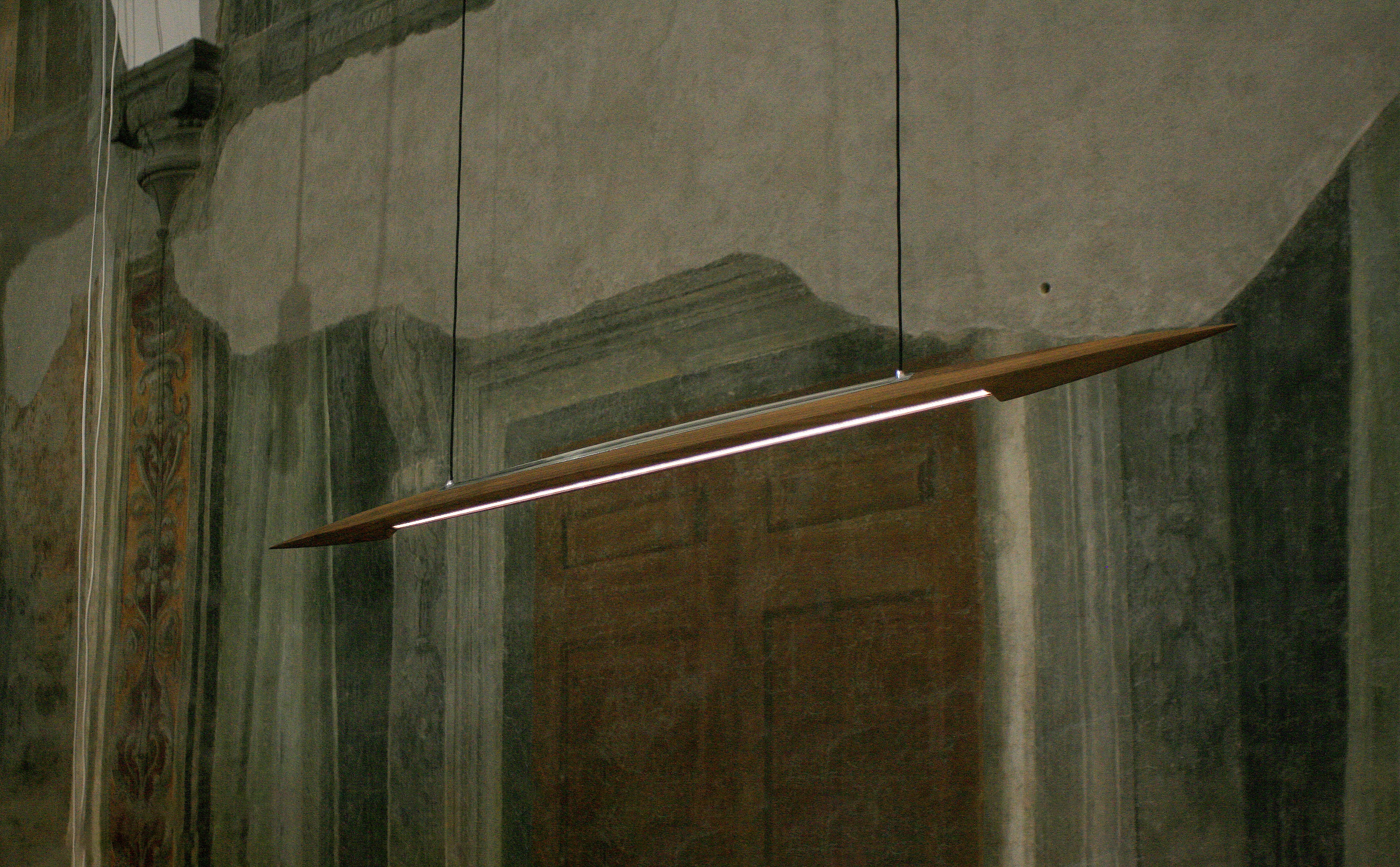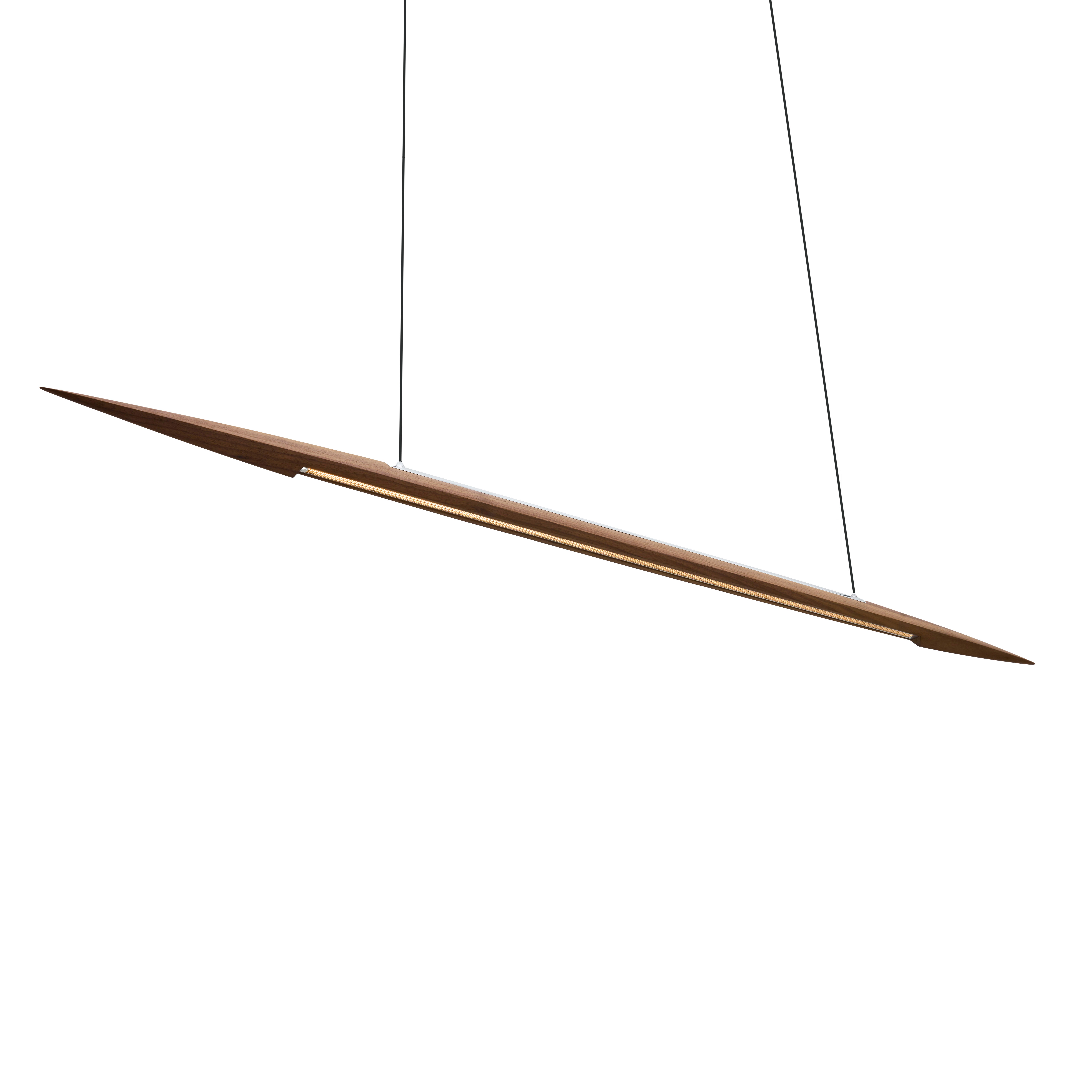 Dimmable pendant with atmospheric to functional light. Suspended by two, thin textile cords, the shade is connected to it’s ceiling canopy that covers the power supply.